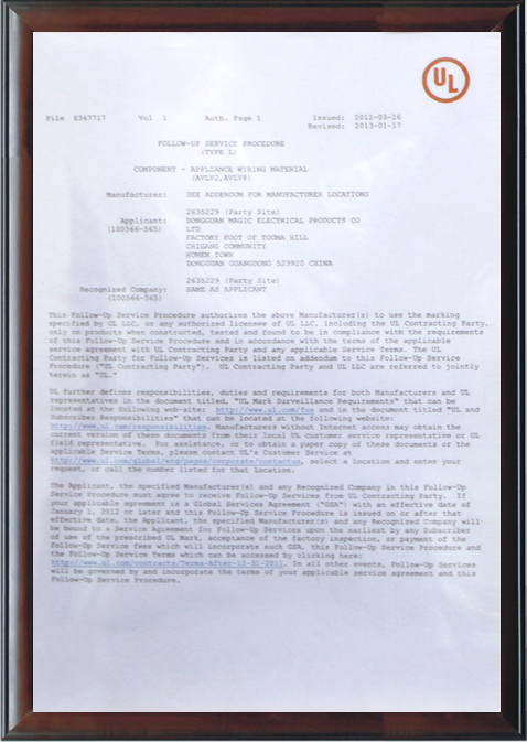 公司通過并擁有電線之UL安規認證,電線加工之UL認證,質量管理體系之ISO9001認證。